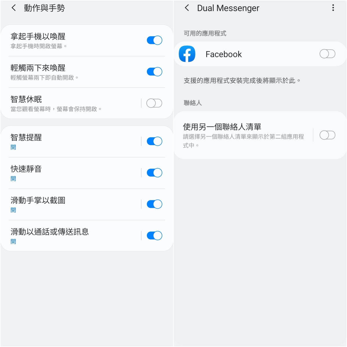 動作及手勢大家也可以看一下有什麼需要設定的部份,像阿湯自己還會開啟「智慧休眠」,因為有些 APP 在預設情況下,即便你是開啟著還是會進入休眠,這時你就可以透過智慧休眠的功能,只要你有持續看著就不會進入待機。