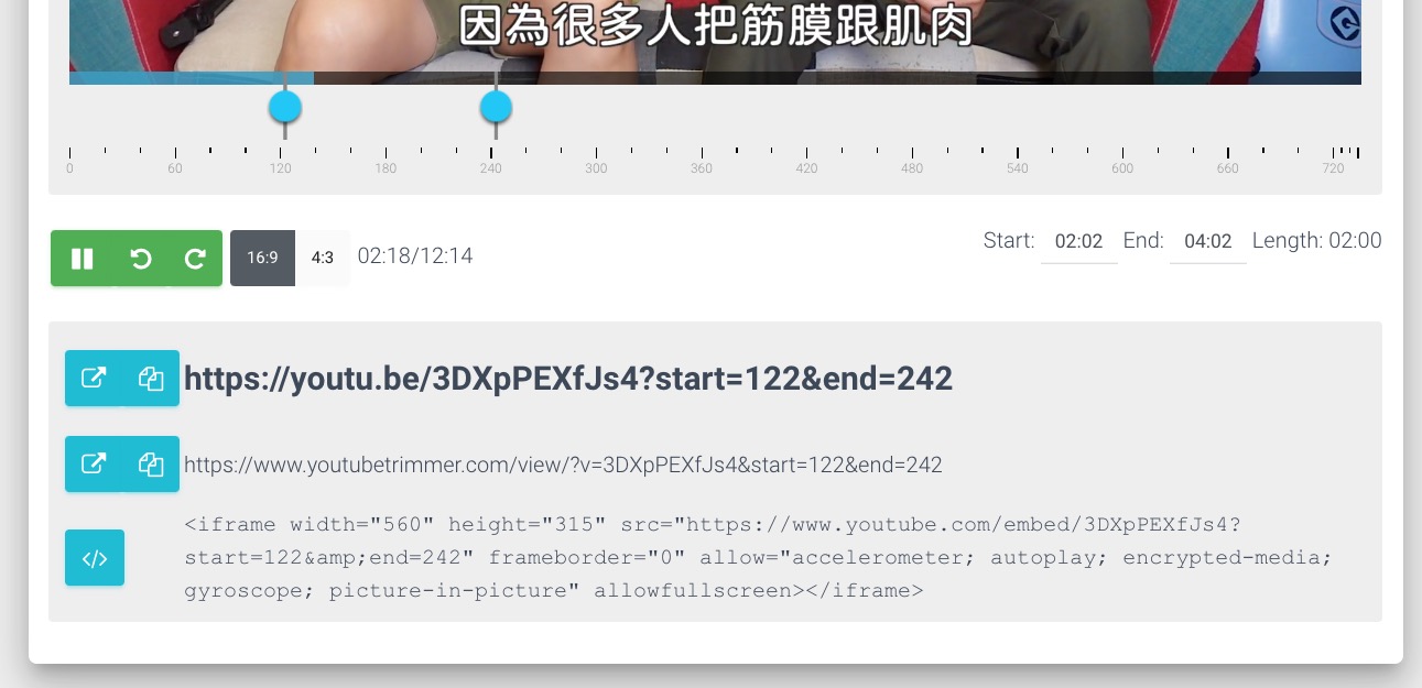 設定好後下方就會有三種分享方式,第一個是 YouTube 本身的頁面,只是幫你加好後綴的參數,第二個是 YouTube Timmer 的頁面,這個頁面開啟 YouTube 的話會是全畫面顯示,第三個則是嵌入影片使用,這個也是原始的 YouTube 代碼,同樣是幫你加入參數而已,三種就看想要用哪一個吧。