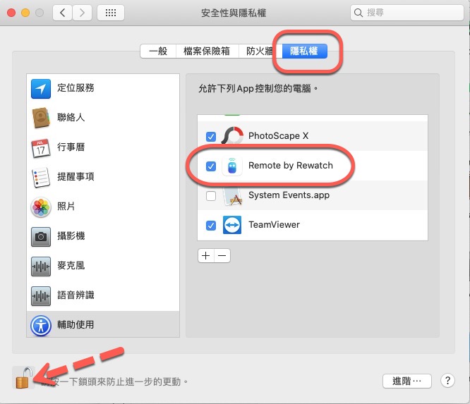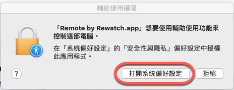 在隱私權裡,找到 Remote by Rewatch 後勾選(無法勾選請按一下左下角的鎖頭,輸入密碼後即可勾選)。