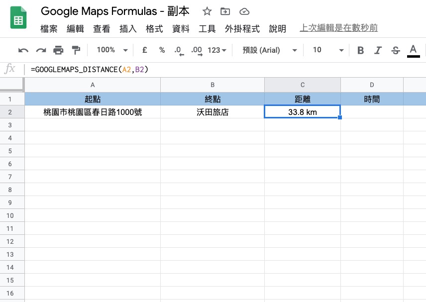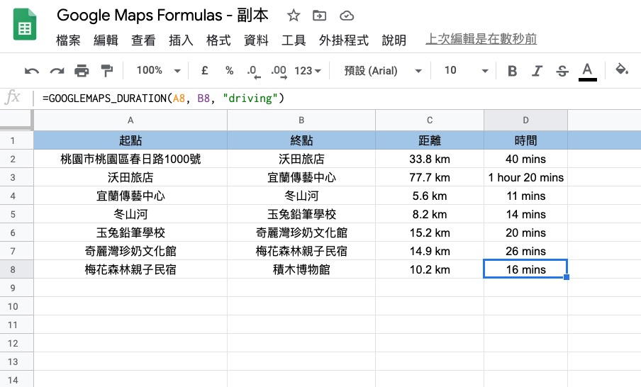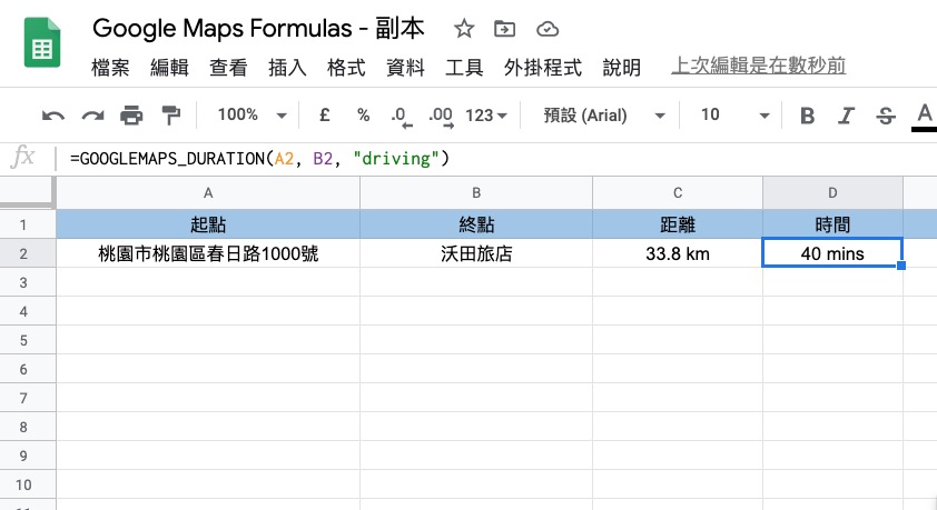 - =GOOGLEMAPS_DURATION("Hoboken", "NY", "walking"):取得地點之間的行程時間,其中第三參數,我後面會說明