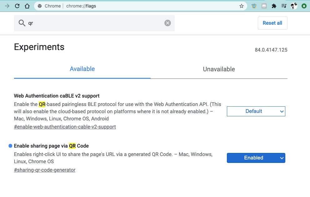 首先在網址列輸入「chrome://flags」,進入設定頁面後,搜尋「QR」,會看到「Enable sharing page via QR Code」,將它改成「Enabled」,然後下方就會出現要你重啟瀏覽器的提示,重啟後就完成了。