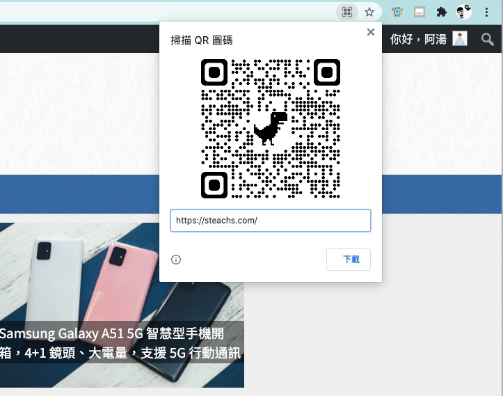 右上角就會立刻跳出產生的 QR Code 囉,中間還帶一支小恐龍超可愛,非常實用。
