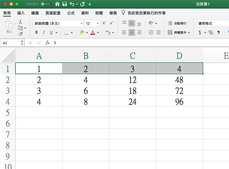 首先,我們先來了解一下陣列的型態,主要有二種,一種叫做「水平陣列」,比如下圖中的 A1:D1,這樣叫水平,只有一行或一列也叫做一維陣列,也就是座標的概念,只有 X。