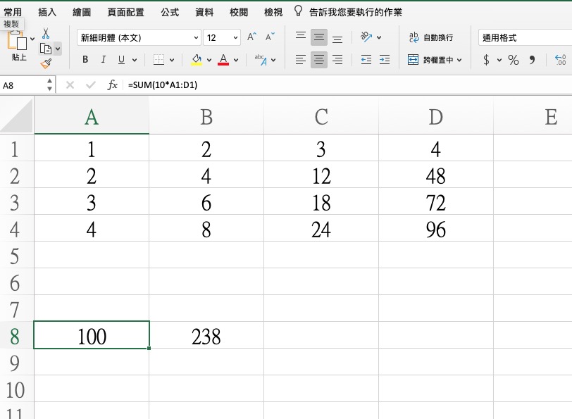 而上面的公式拆開後就長成 = 10*A1 + 10*B1 + 10*C1 + 10*D1,最後答案就是 100。