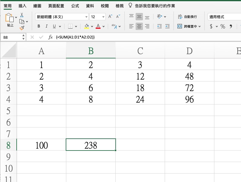 再來是二層的陣列互相乘積相加,比如我們要做的陣列公式如下: