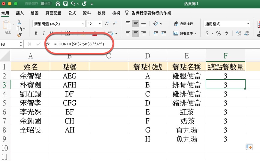 接下來教大家要怎麼計算,因為像是點餐欄是多個英文字的狀況下,我們要怎麼各別統計出 ABC 的數量。