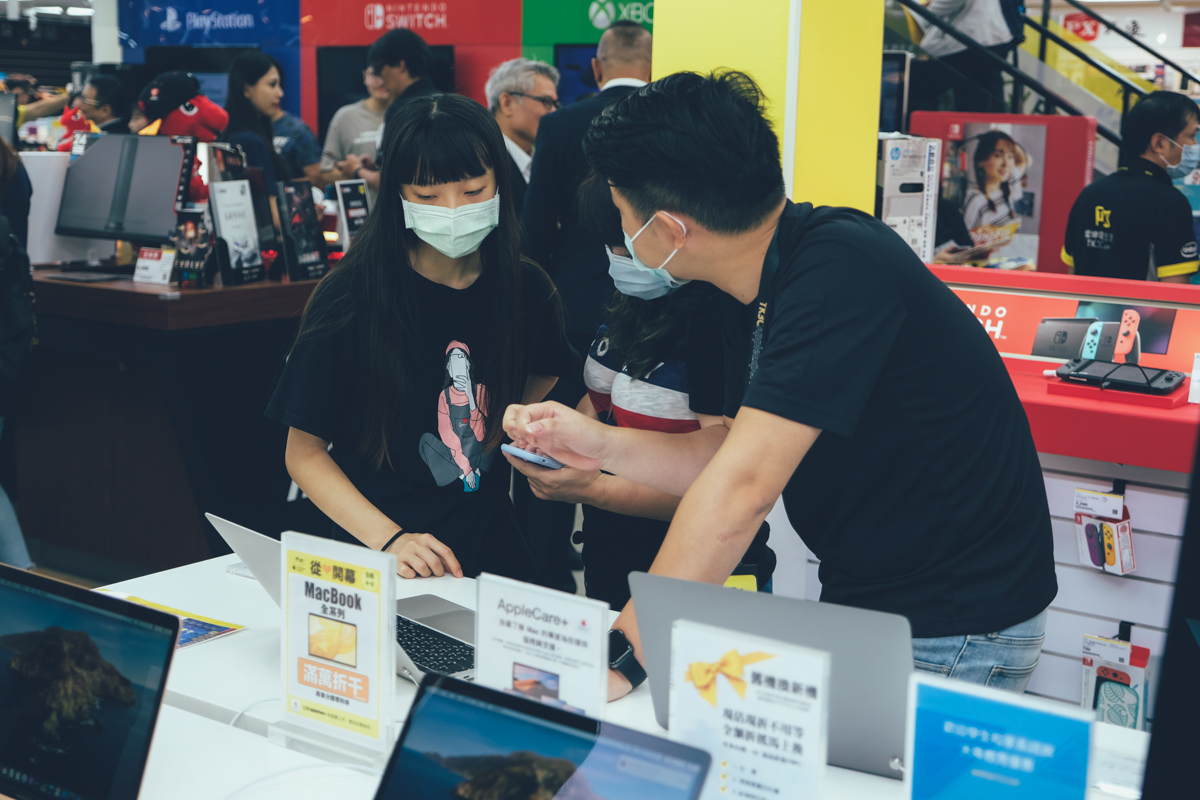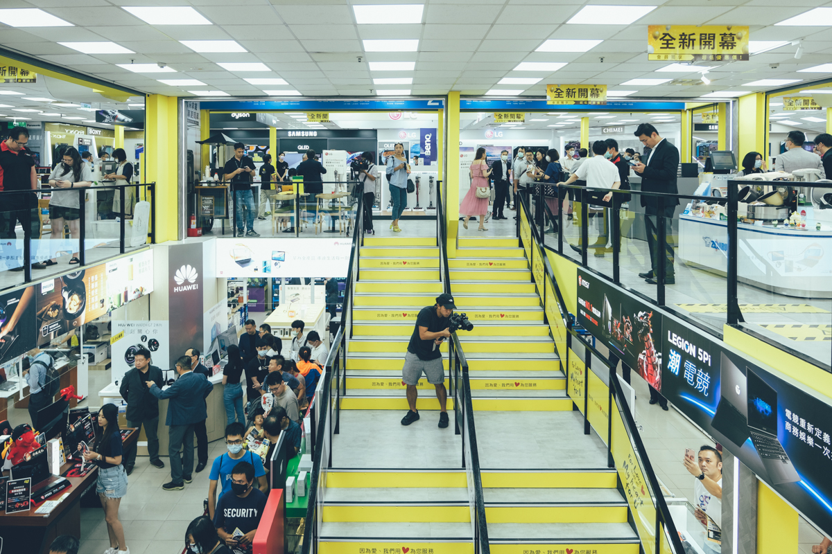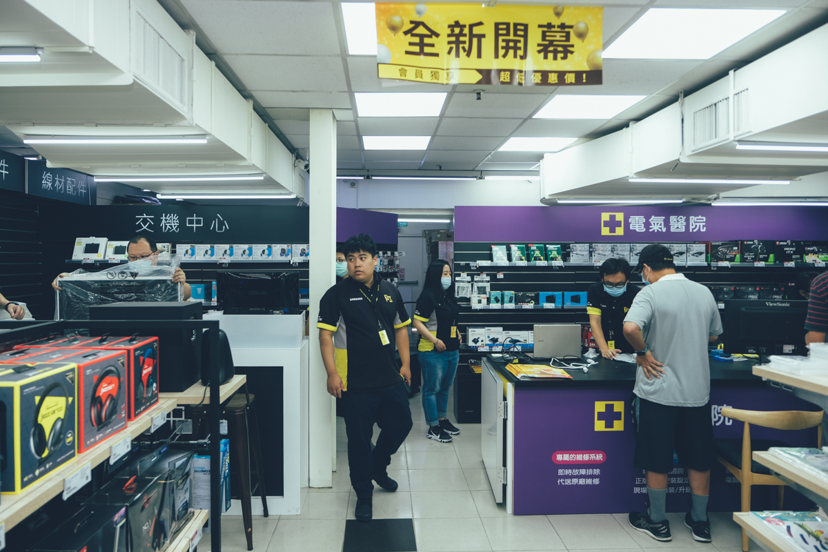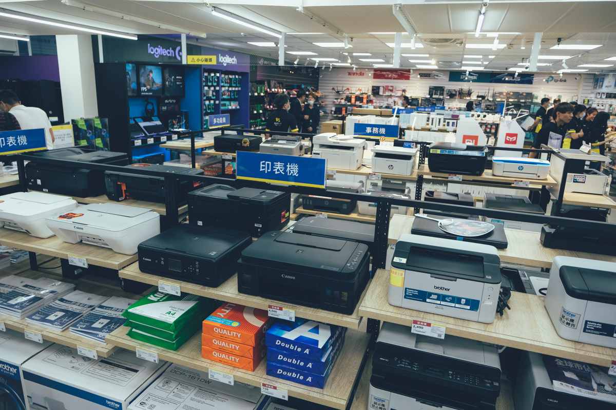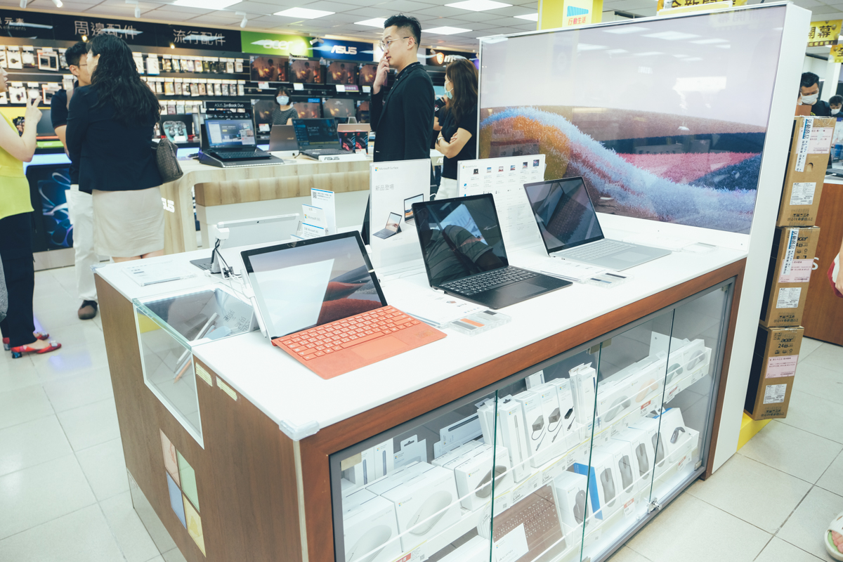 以一樓來說,是以電腦、手機或是相關配件為主的區域,在以往這類商品的電子產品門市店面,都會將產品放的很雜亂、品牌超級不區分,甚至是一點都沒關聯性的商品也放在同一貨架上,即便你想要速戰速決的跑去問了店員,得到的答案是:請稍等,我先幫你找一下。然後十分鐘就默默的過去了,這也造成了愈來愈多人不喜愛在實體店面購買商品的原因之一。