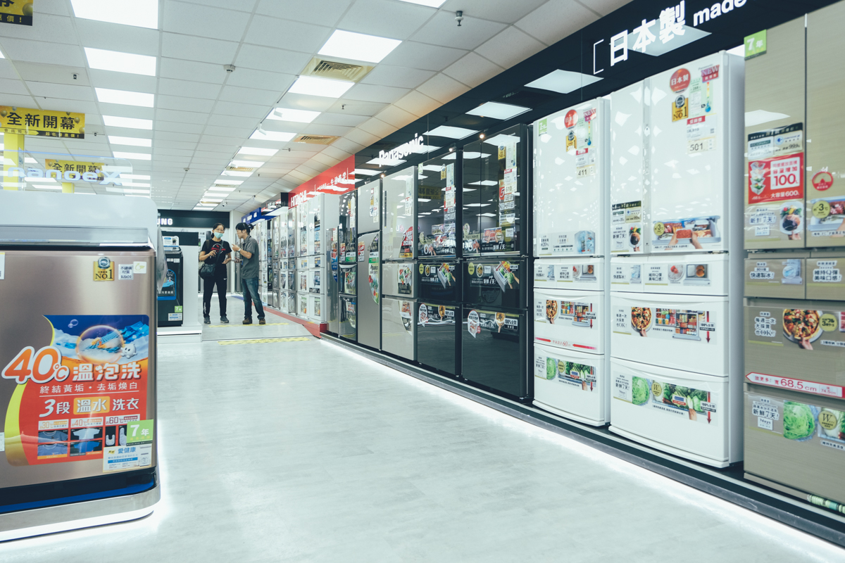 然後我走到冰箱這一區時,有讓我心裡為之一驚,在我的印象中,好像還沒有看到哪一個賣場是將冰箱這麼整齊的一字排開的,而且非常長一條,想要挑選冰箱,一路給他走到底,應該心裡也會有底了,逛家電真的是超爽快。