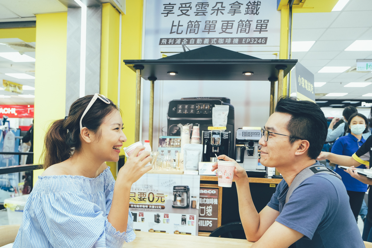 在二樓一上來的地方,馬上可以看到飛利浦的全自動義式咖啡機,在這活動期間來這裡逛家電,累了還可以坐在這裡小憩一下,喝杯免費的咖啡,看你是要義式濃縮、美式、拿鐵還是卡布奇諾通通有。