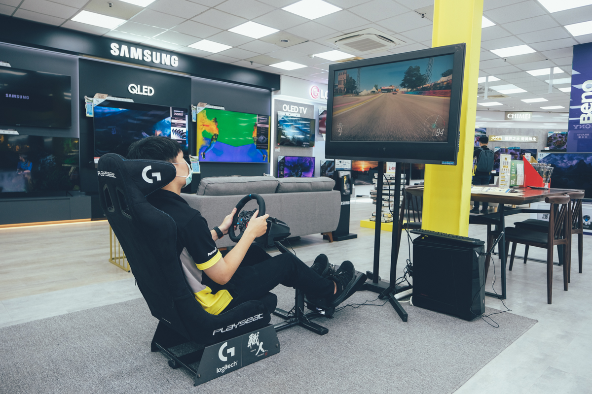 二樓電視區一旁還放了一個相當專業的賽車配件讓你可以玩,阿湯自己不好意思給他開下去(怕屁股離不開),但我想帶小朋友來逛家電的話,應該只要把他們放在這個位置,2 小時都不會移動吧,但你可能要看看運氣,現在是正好有體驗活動才放了一組賽車,不過其實還有一樓的遊戲主機體驗區,我想也不怕沒東西定住這些小小孩們。