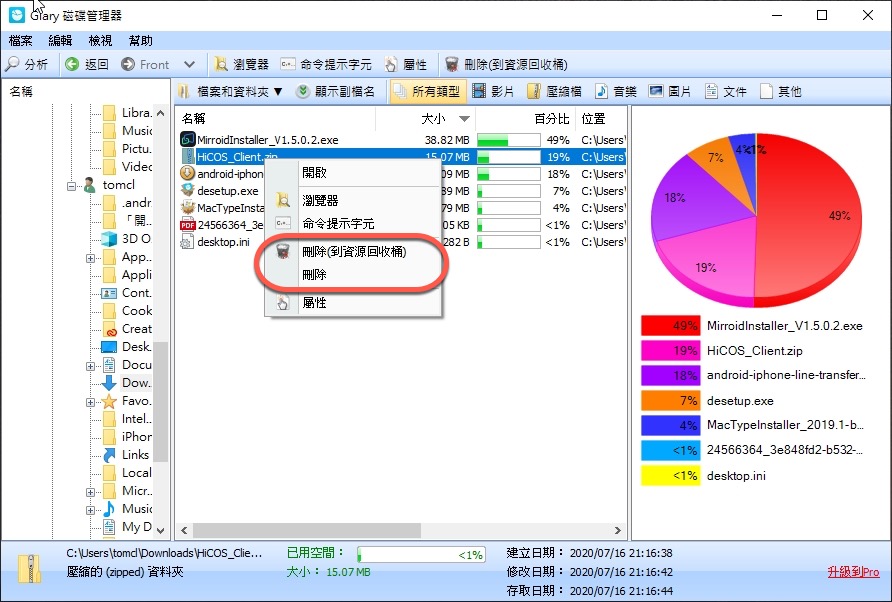 要刪除檔案時,直接在檔案右鍵,可以選擇直接刪除或暫時先丟到資源回收桶,相當的簡單易用,藉由這軟體就可以快速的分析電腦檔案佔用狀況,也能直接清掉不需要的檔案,不浪費時間。