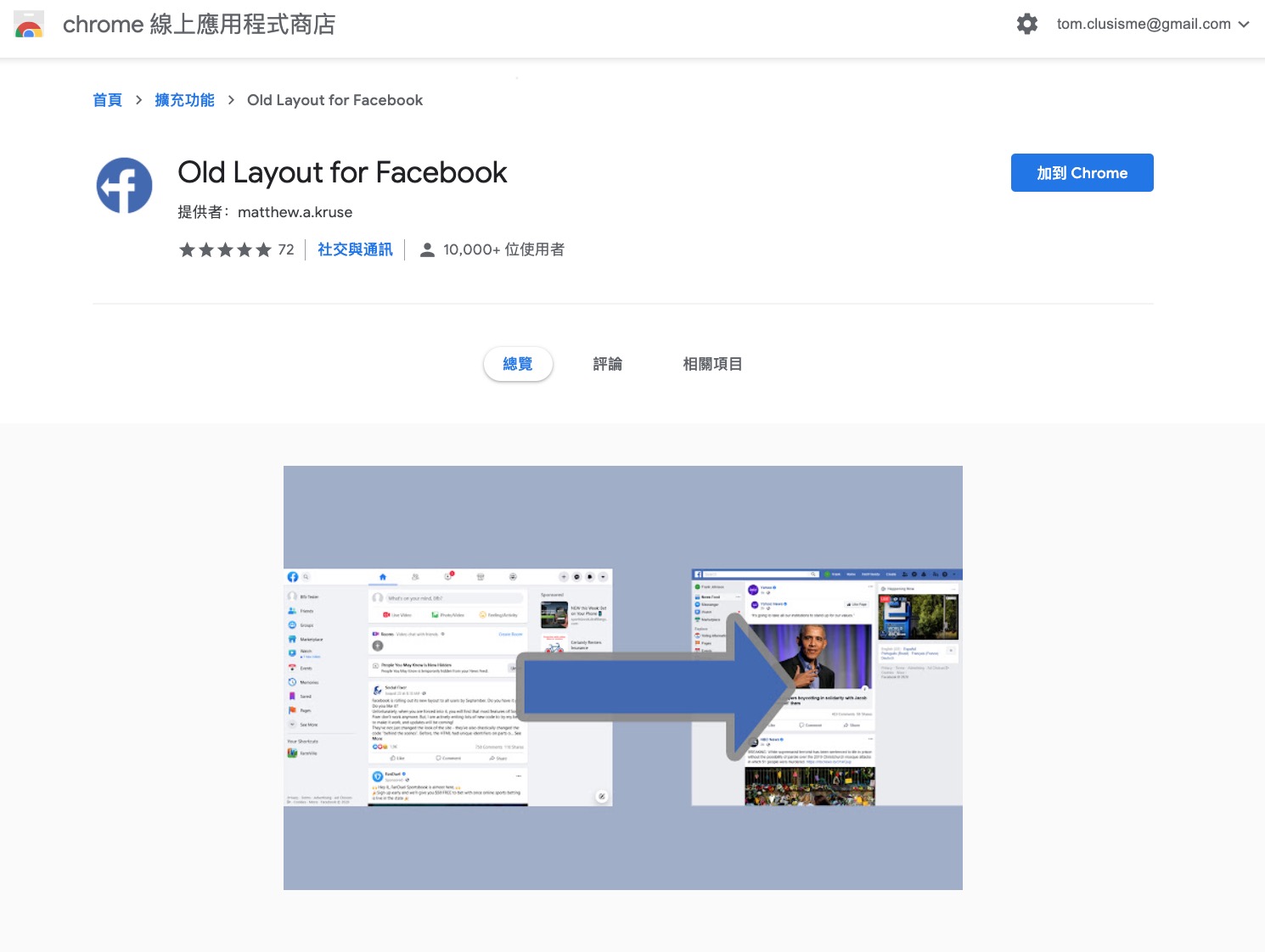 Chrome Store 下載:請點我前往如果你想要暫時不去面對新版 FB,也不想二天按一次切換,那就試看看安裝這個外掛,直接加到 Chrome 即可。