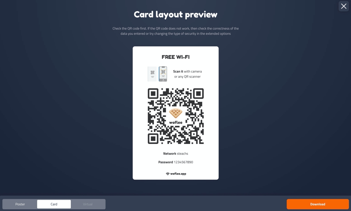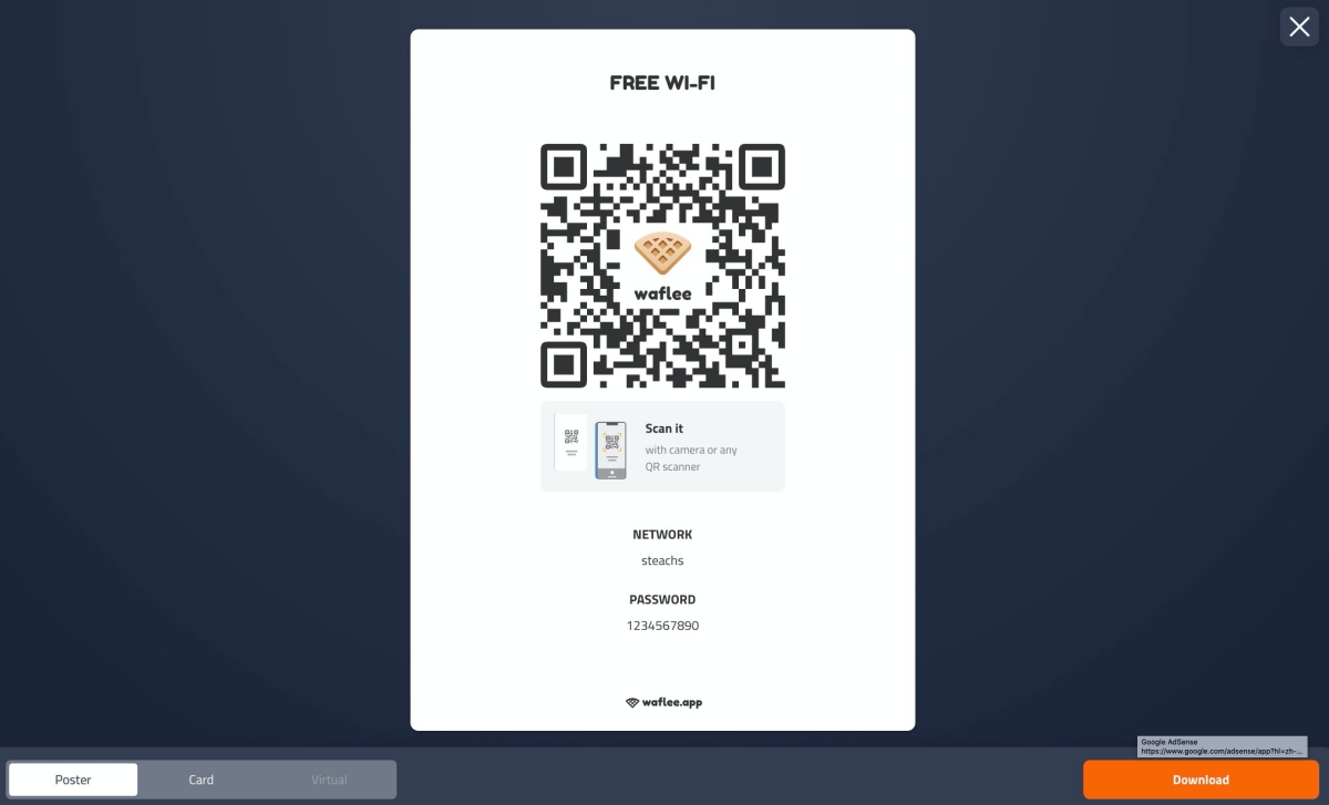 產生後會有二種形式可以下載使用,一個是像這樣做成比較大的展示給客人使用,除了 QR Code,在下方也會保留原本的 SSID 跟密碼。