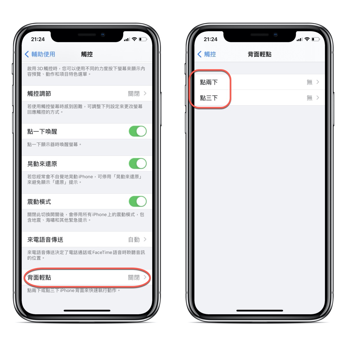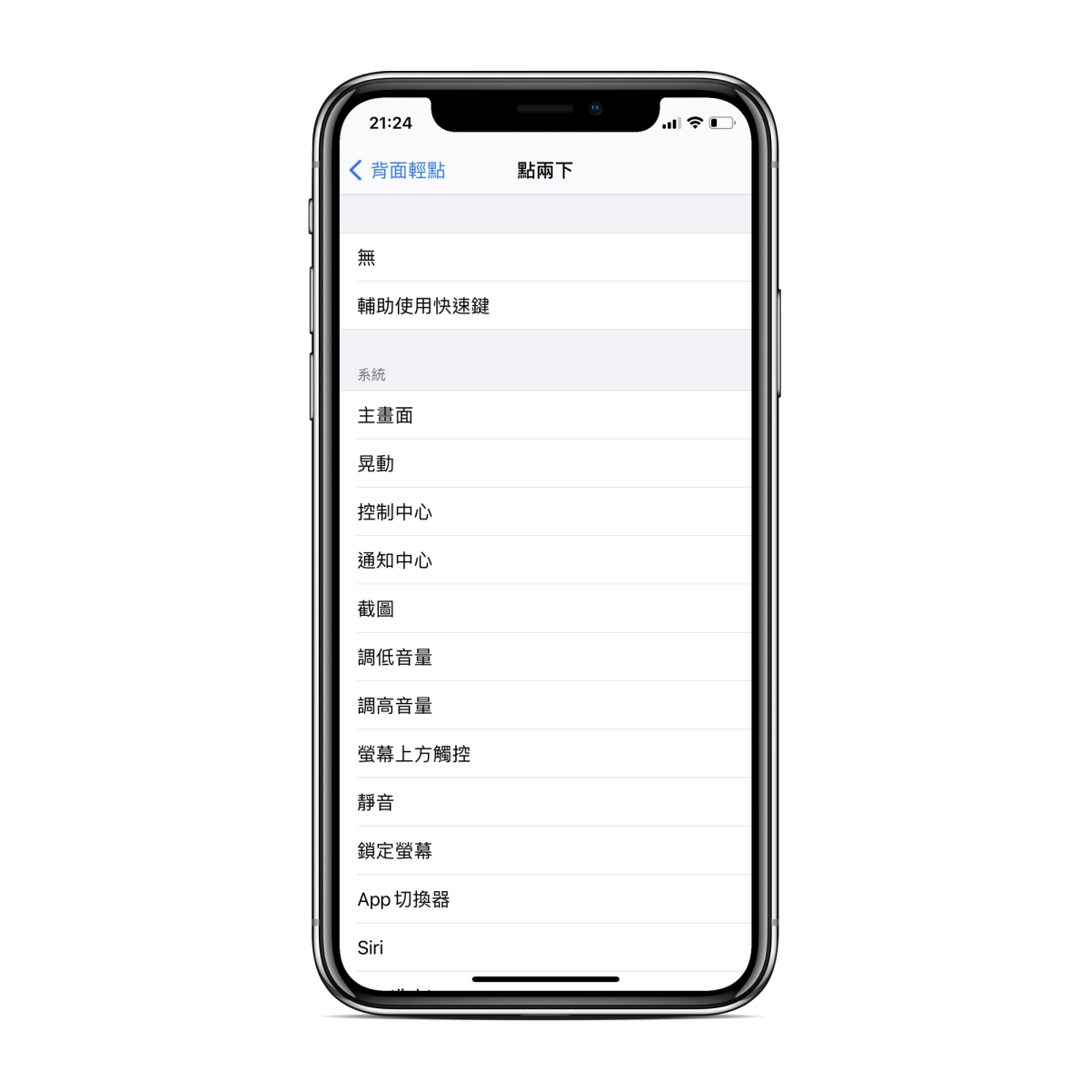 往下拉到底,就可以看到「背面輕點」這功能,預設是沒有打開的,可以設定的包括點二下跟點三下各自可以做什麼操作。