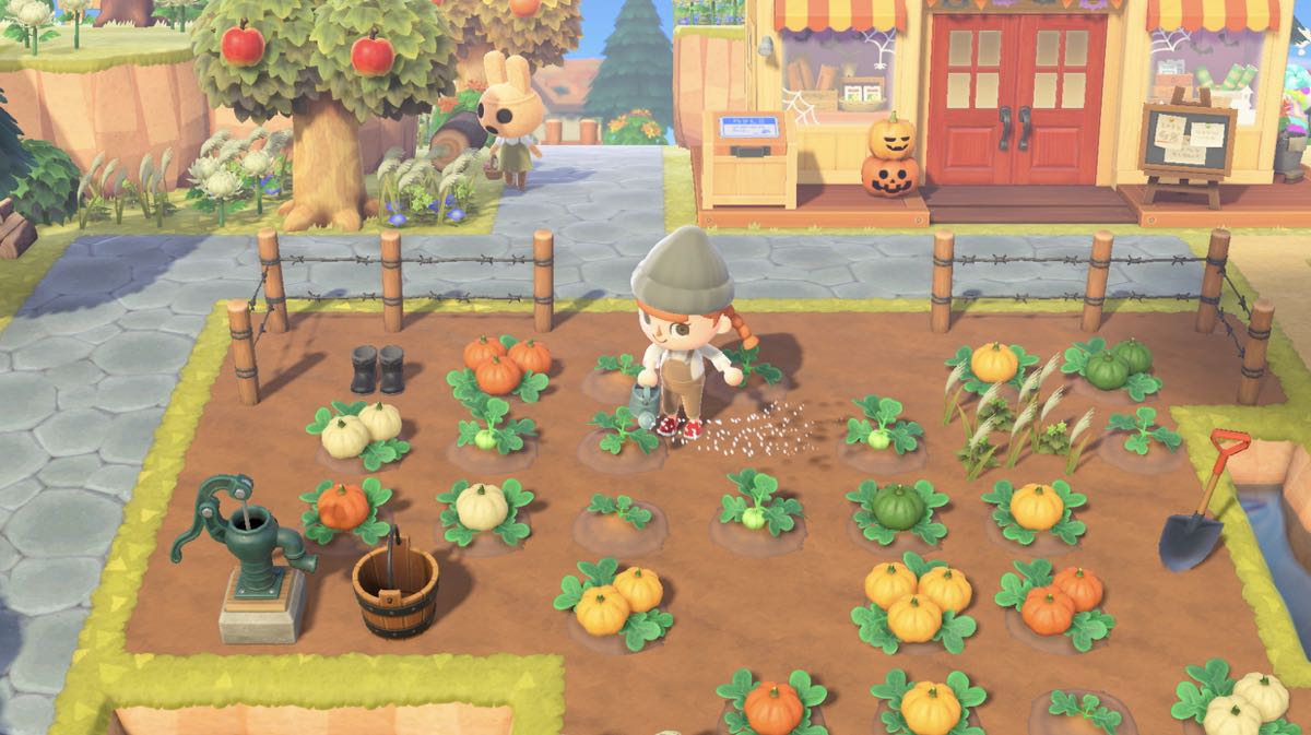 在 Nook商店或是然然的店裡可以買到「南瓜的樹苗」來栽種,細心地澆水種植,就能結更多的果實,然後種出來的南瓜能當作 DIY 萬聖節主題的材料。