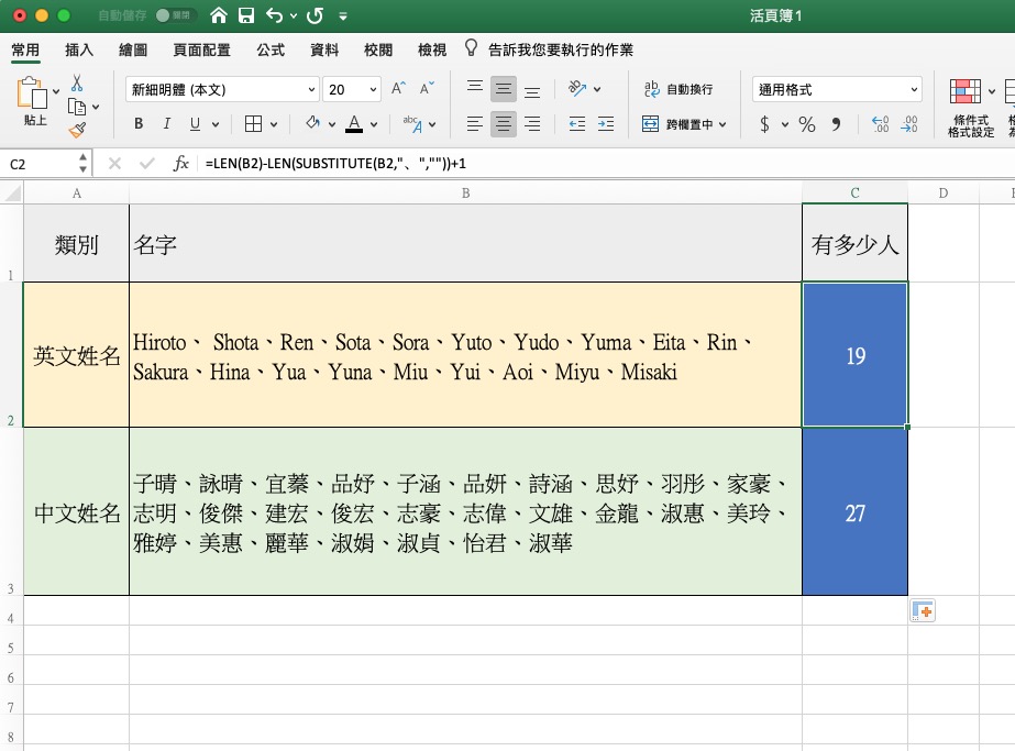 這邊加上了 LEN,LEN 是用來計算「字元」數有多少,所以看到這裡應該有點理解了吧?我們是先將「、」去掉後,計算字元數有多少,接下來我們最前面加上了 LEN(B2) 去減掉後方已經扣掉符號的字元數,LEN(B2) 是完整字元數,這麼一減,就會知道「、」這符號有幾個,最後再加上 1,就是全部的姓名數量有多少了,是不是相當簡單呢?