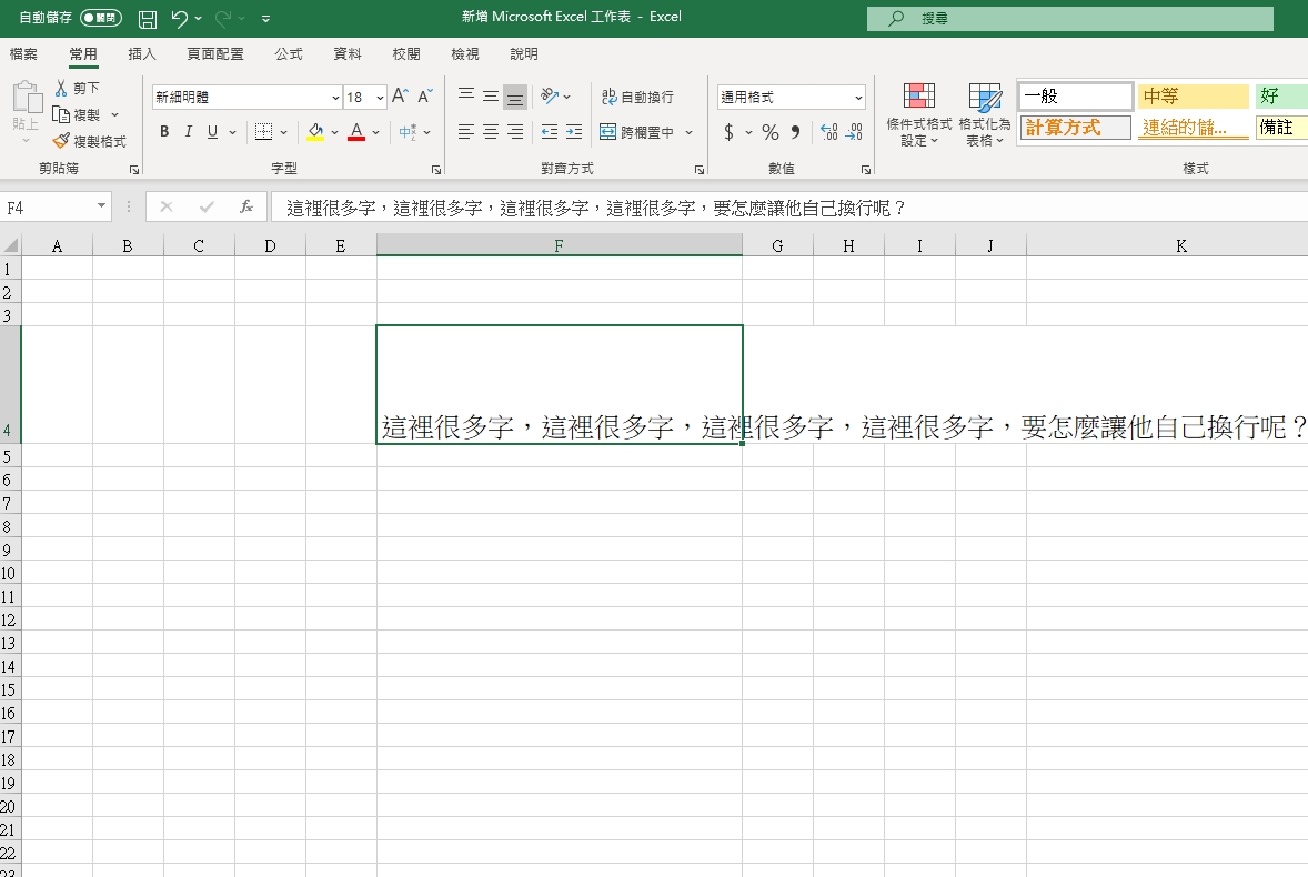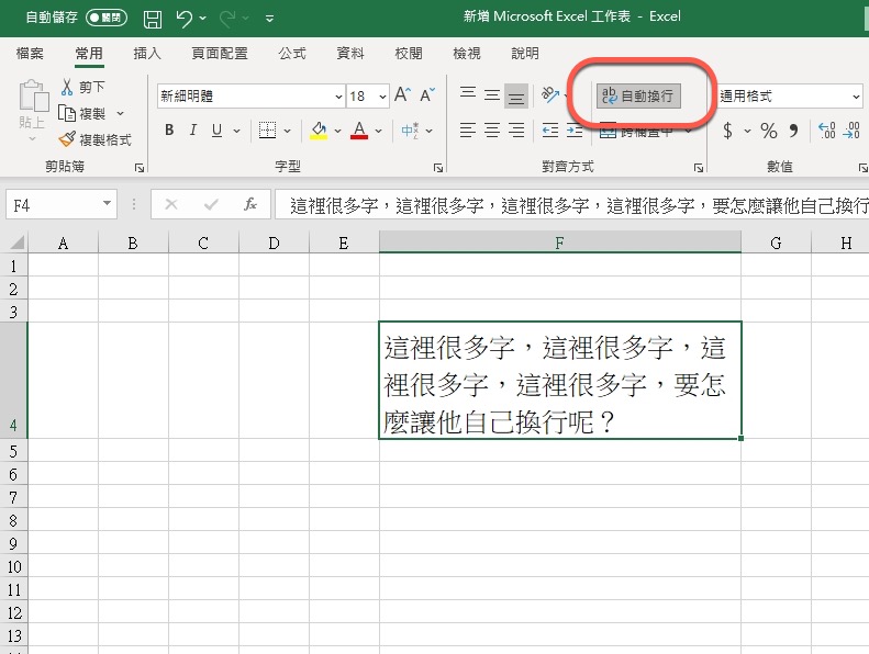 首頁 › 電腦小教室 › Excel 小教室 - 超出欄位的文字要怎麼「自動換行」,別再無限的拉寬欄位了 Excel 小教室 - 超出欄位的文字要怎麼「自動換行」,別再無限的拉寬欄位了 發佈日期:2020/10/6 作者:阿湯 分類:電腦小教室 今天來分享一個超級超級小技巧,因為阿湯實在看太多為了欄位內容而一直「拉寬欄位」來符合內容,如果你的文字很長很長不就變的很奇怪了嗎?有時候排版要適當的使用一些小技巧,比如 Excel 文字超出欄位真的太多的話,我們也可以讓文字換行就好,這裡講的不是 Alt + Enter,而是真的依據欄位寬度自動換行,只要按一下就可以達成,往下來跟大家分享吧。 Excel 教學 - 超出欄位的文字要怎麼「自動換行」 首先就像這樣,很多人直接在 F 欄右線點二下讓內容自動寬度,接下來就會看到 F 欄位寬到一個爆炸,拜託不要這樣排版,真心醜到沒朋友。 以後請直接在「常用」頁籤裡,按下「自動換行」,就搞定了,是不是 5 秒就學到了,以後請善用,下課。 延伸閱讀 macOS教學 - 如何設定自動開機/關機排程? 2025/1/5 如何將不同 Email 帳號進行內容合併?以 Google 的 Gmail 帳號為例 2024/10/17 Excel 教學 - 如何製作出指定抽獎機率的抽獎工具? 2024/9/14 Excel 教學 - 利用小技巧同時凍結表格的上跟下 2024/8/5