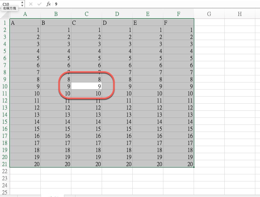 再來是像這種不含標題的表格,任選一欄資料後按下 Ctrl + A,就會選取整個資料表範圍,再按一次 Ctrl + A 就會全選整個工作表。