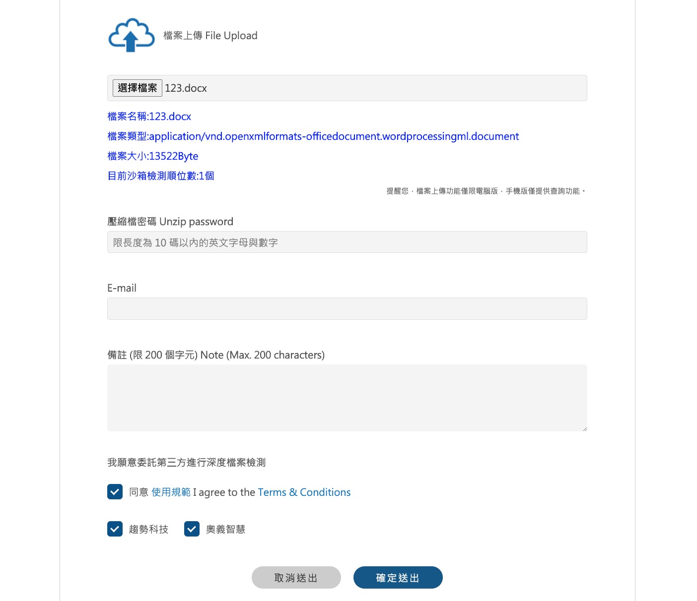 網站:https://viruscheck.tw/index.html使用很簡單,只要將檔案選擇後上傳,然後再選擇要給趨勢科技還是奧義智慧,或二個同時進行檢測分析,如果檔案是有壓縮密碼的記得預先輸入,Email 的部份可填可不填,可以直接線上等結果。