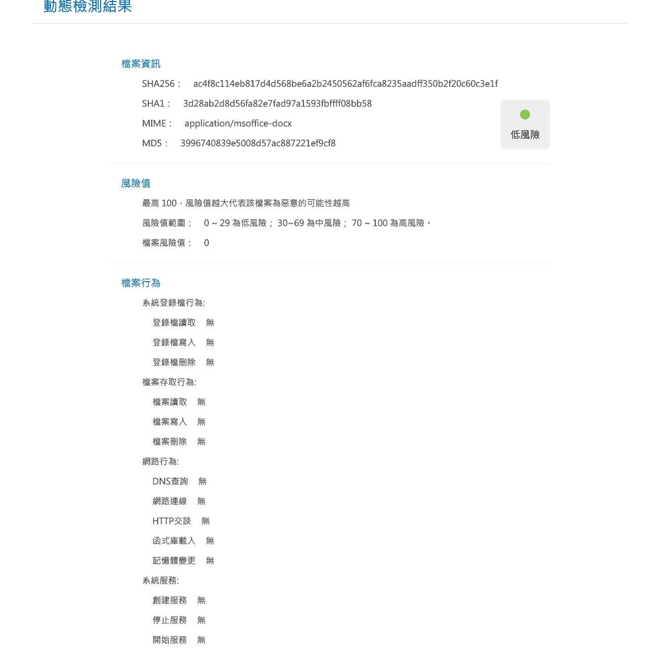 深度分析就像這樣,基本上低風險就可以說是沒任何問題,中風險以上就建議不要打開了,如果你沒有使用防毒軟體的習慣,可以考慮看看用這樣的線上檢測服務就好。