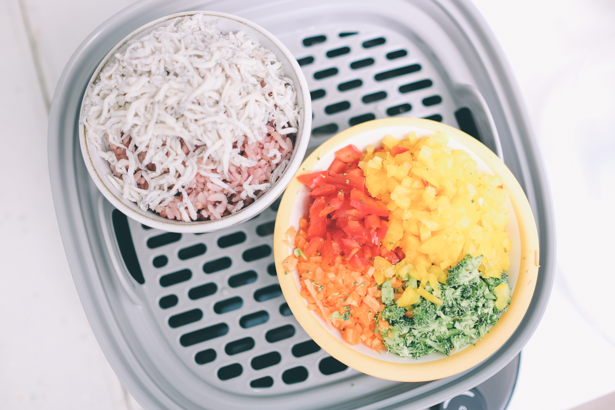首先我準備的食材包括有蒸熟的飯(紫米、糙米、白米都可以),吻仔魚(或肉末也可以),然後四種顏色的蔬果。