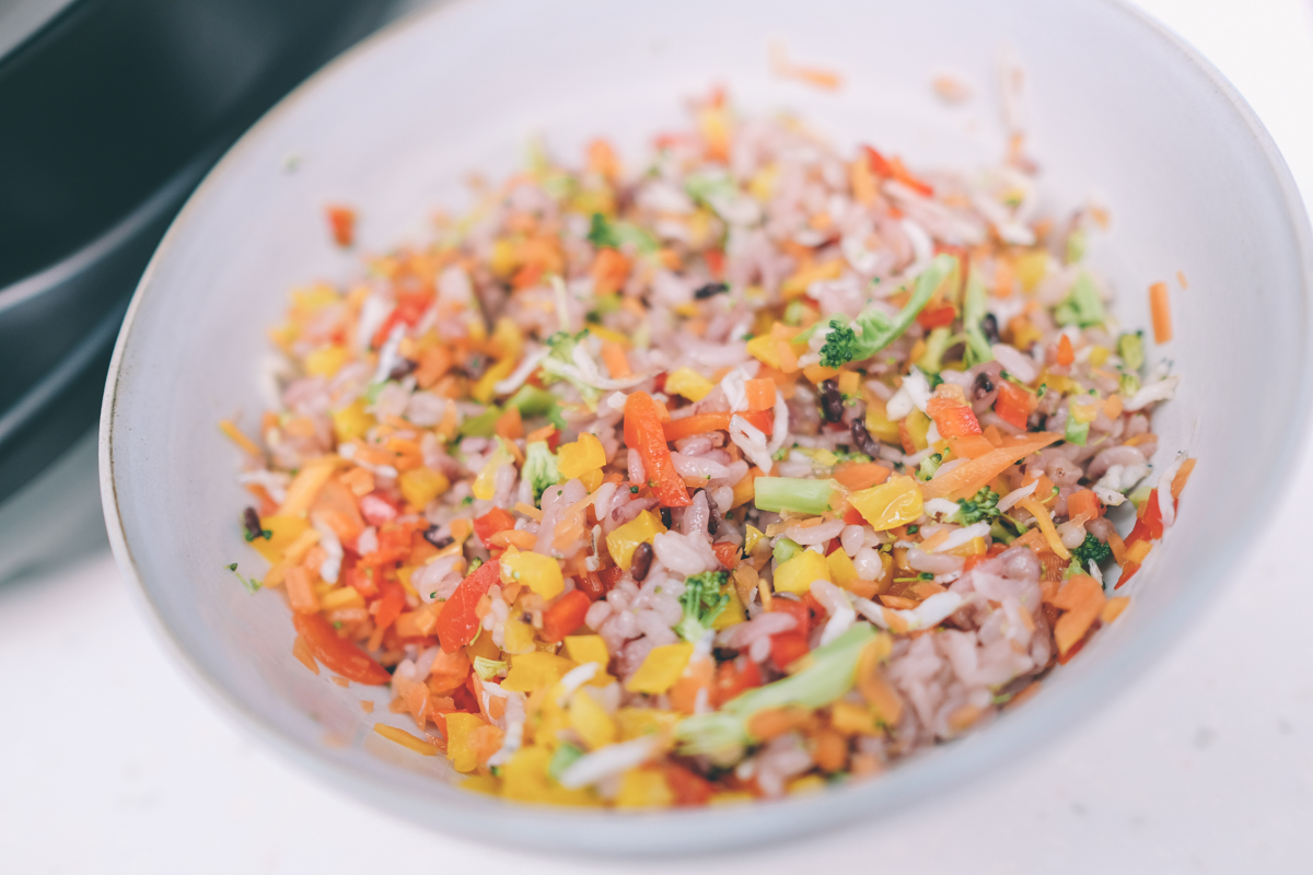 如果切的比較碎一點的話,基本上只要蒸一輪 10 分鐘就綽綽有餘,再把食材都拌在一起,就會變成多樣化又健康的燉飯了,你也可以依小朋友的年齡適當的加一點醫油、胡椒粉等做調味。