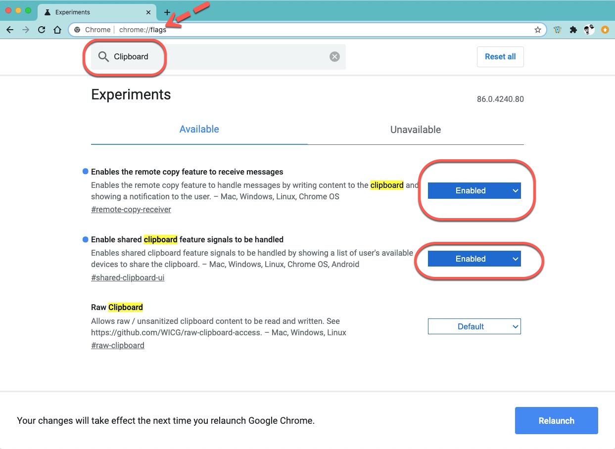 首先在電腦版上的 Chrome 網址列輸入「chrome://flags」,接下來搜尋「Clipboard」,將前二個選項都改為 Enabled 啟用,然後右下角按 Relaunch 重新啟用。