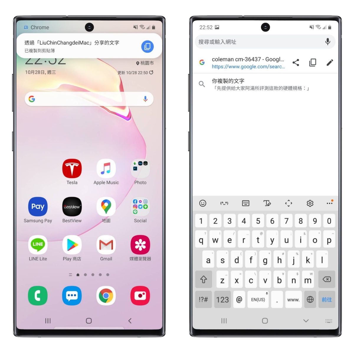 成功傳送後,像 Android 手機會直接跳出透過哪裡分享的文字,直接複製到剪貼簿,就可以去任意地方貼上使用了,如果是像 iPhone,傳送後,在 Chrome 裡的網址列也可以看到你複製的文字,相當方便。