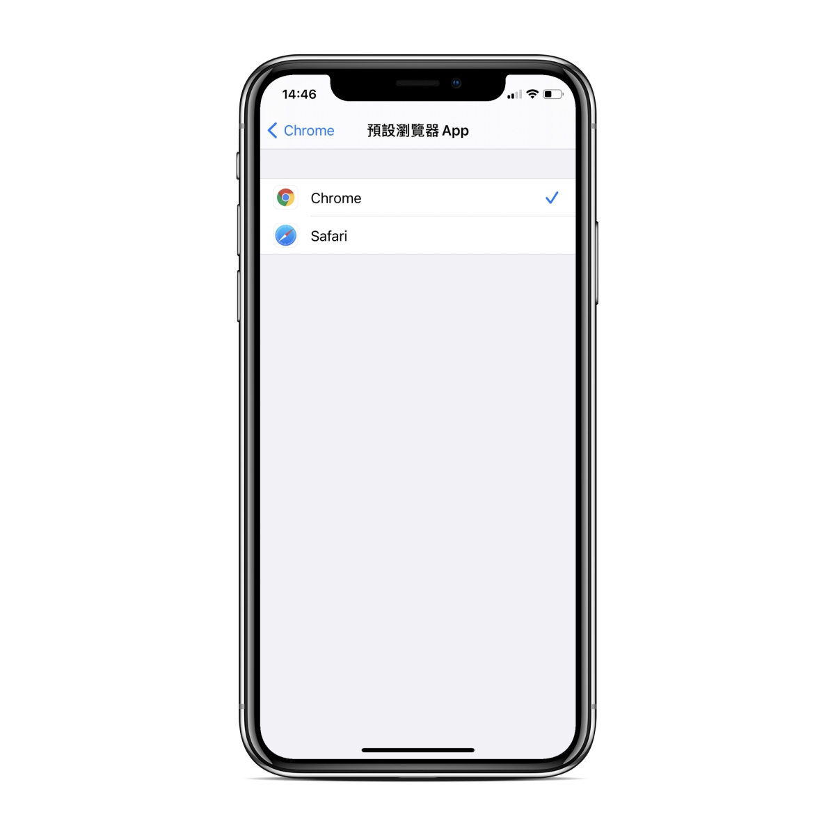進入設定之後,往下拉找到你自己常用的瀏覽器,像是 Chrome、Edge 或是 Firefox 等,記得要先安裝,以 Chrome 為例,你就點進去後,會看到多了一個「預設瀏覽器 App」的選項,這部份我試了一下,除了 Safari 之外的瀏覽器都會有這選項。