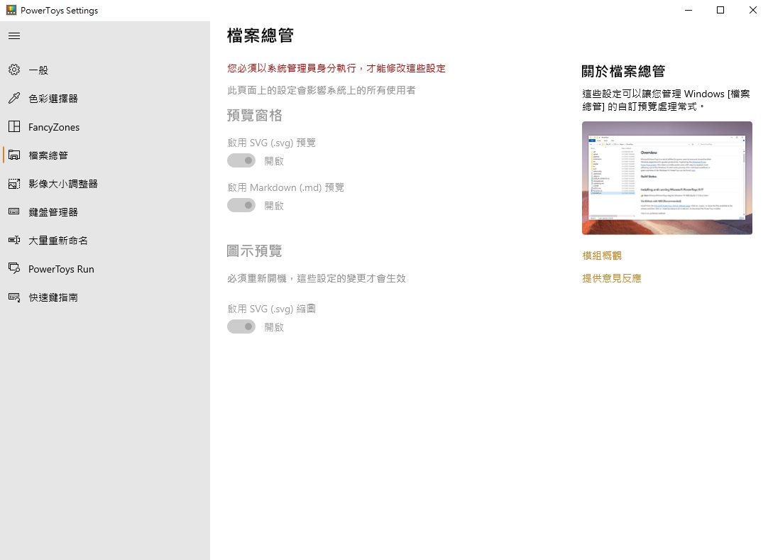檔案總管的部份如果要使用,可以在一般裡重新以系統管理員執行,不過重點是可以支援查看 SVG 向量圖檔的預覽跟縮圖。