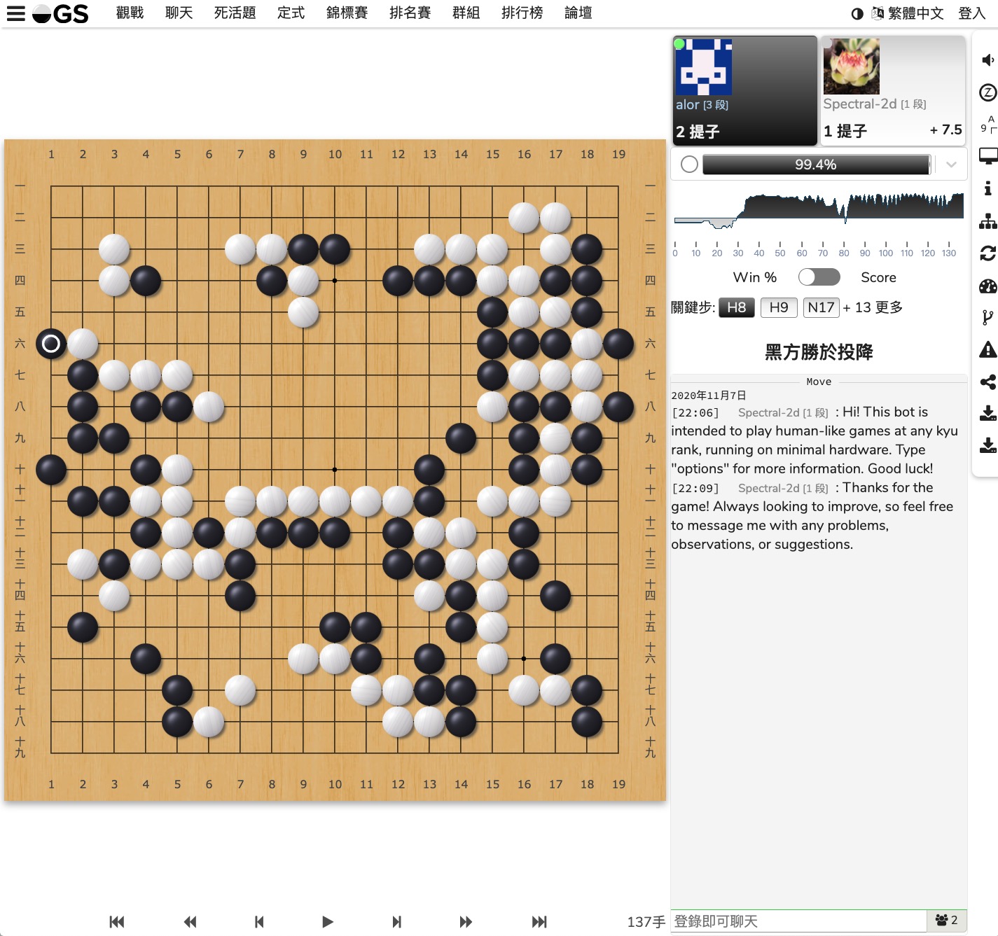 觀戰如果已經結束,也可以看到勝出多少子等資訊,方便你再復盤。