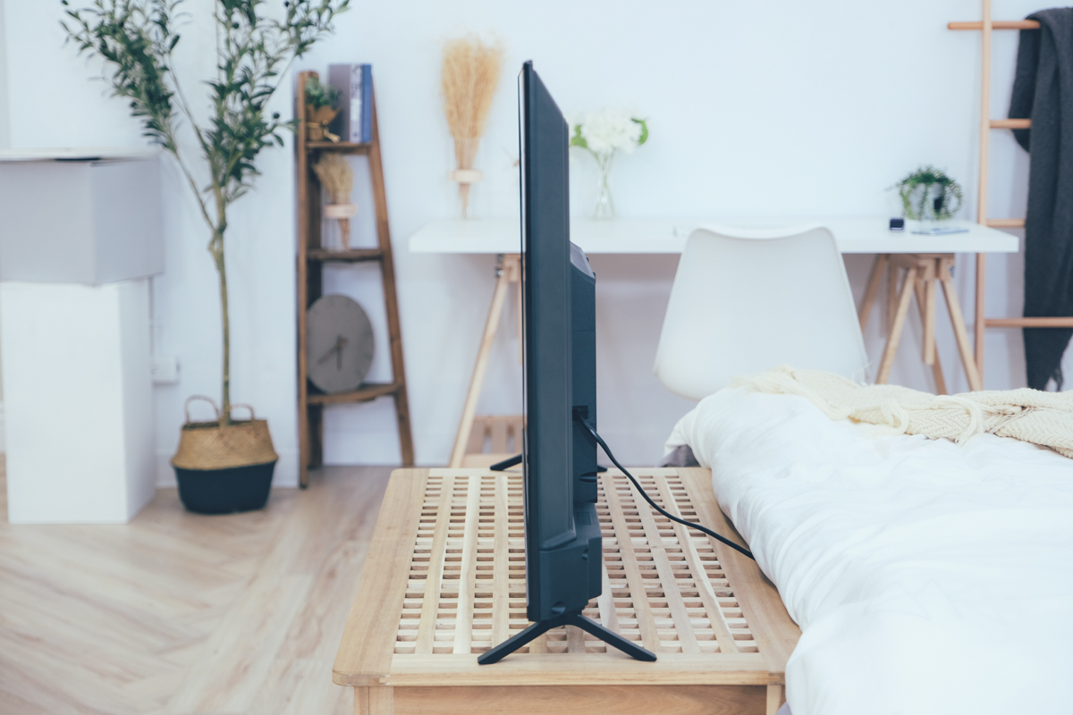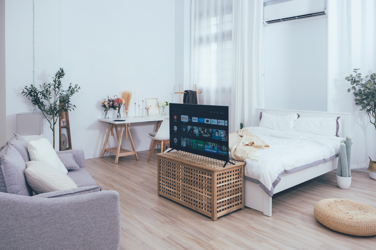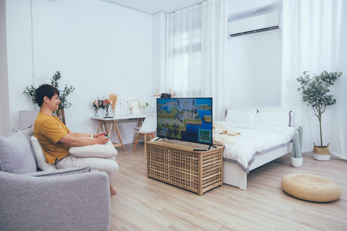 如果是以 7~8 坪左右的小套房來說,像阿湯這樣的擺放是沒什麼問題的,你可以擺在沙發跟床的中間來使用,像這樣沙發跟顯示器距離大約是 1.5 公左右,看 43 吋的距離算是適中。