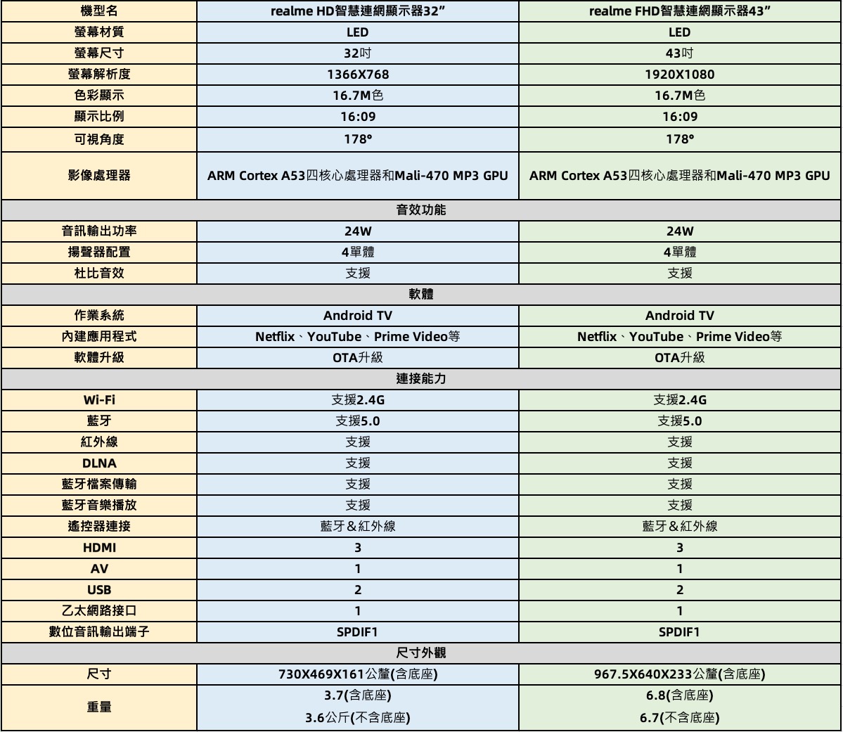 往下看之前先提供大家這次 realme 推出二種不同尺吋的智慧連網顯示器規格比較表,基本上二台只差在尺吋、解析度跟重量,其它都是一樣的,提供給大家參考。