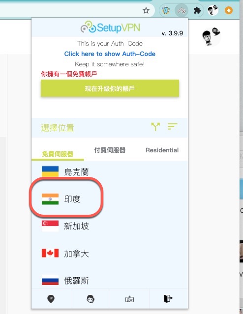 首先是要跨 VPN,為了讓大家省點錢,我也就不推薦的用付費的 VPN,只要找免費的 VPN 且有印度的伺服器就可以了,像是這個我幾年前就分享過的 SetupVPN,到現在還是蠻穩定的。
