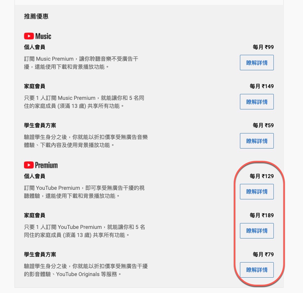 然後重新整理剛那頁面,你會看到幣別已經變成盧比了,換算下來個人會員只要 49 台幣左右,家庭是 72 台幣,就連上面的 Music 會員都變便宜超多了。