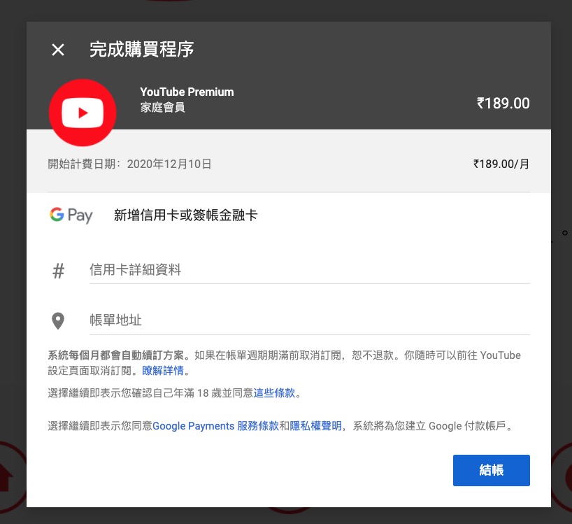 購買完後就會看到你的頁面上是顯示每月 189 盧比了,即便你把 VPN 關掉回到台灣,一樣顯示這價格。