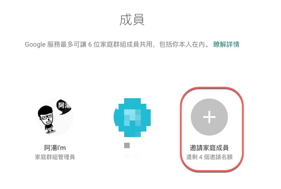 如果你想要管理家庭成員的話,可以到上述網址,然後再一一的把家庭成員加入就可以了,這邊提醒一下大家,YouTube 每月都會去檢查家庭成員的區域,基本上一定要在同一區域,否則會被自動移除,所以要給朋友用的話,千萬不要不是台灣人。