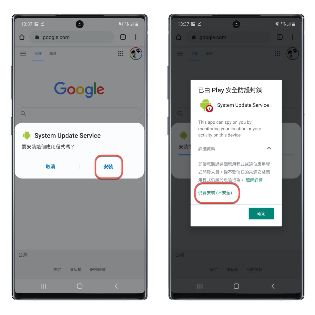 APP 名稱會是偽裝成 System Update Service,下載後直接安裝,中間會跳出「已由 Play 安全防護封鎖」,展開後選擇「仍要安裝」就可以了。
