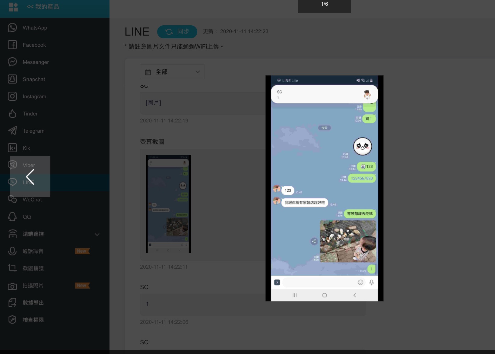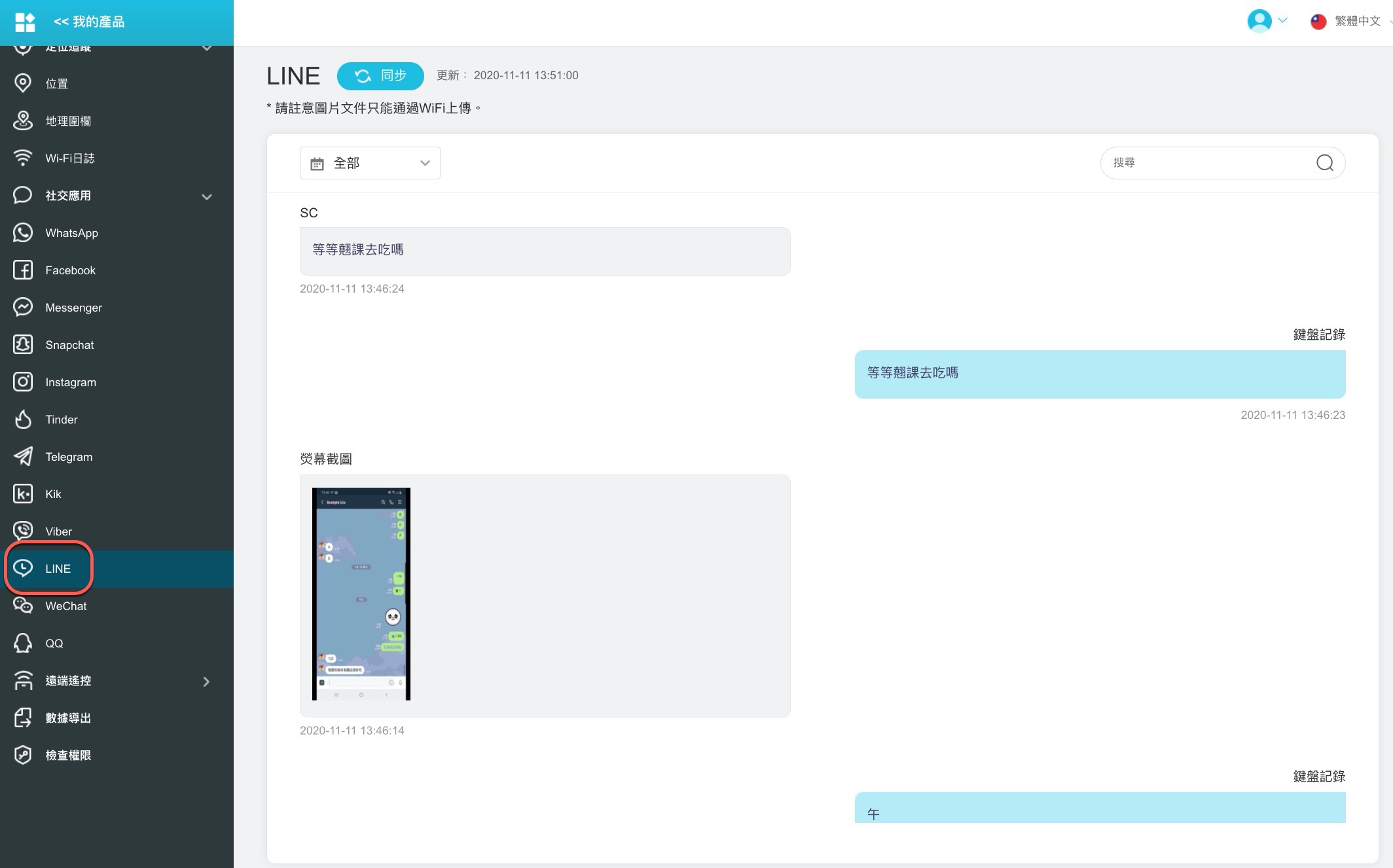 除了上面阿湯挑選的幾個功能外,接下來的二項功能肯定是大家最有興趣的,第一個是社交應用,也就像是 LINE、FB Messenger、Whatsapp、IG 等,只要有傳送內容就可以在這裡查看,而且還可以看到螢幕截圖(原始的畫面),這樣你要對質時也有個依據(但應該會吵翻天吧)。