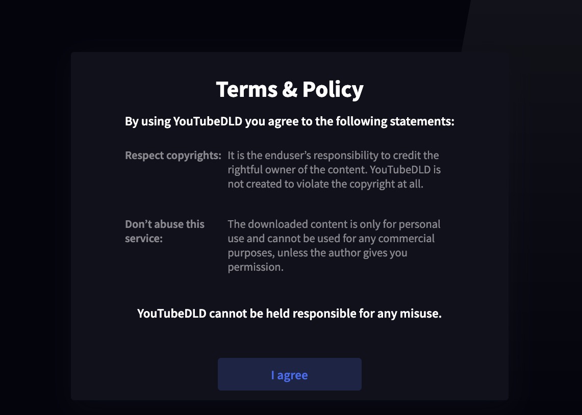 變成:https://www.youtubedld.com/watch?v=O-TPGIhUbJI按下 Agree 同意條款就會進入主要畫面。