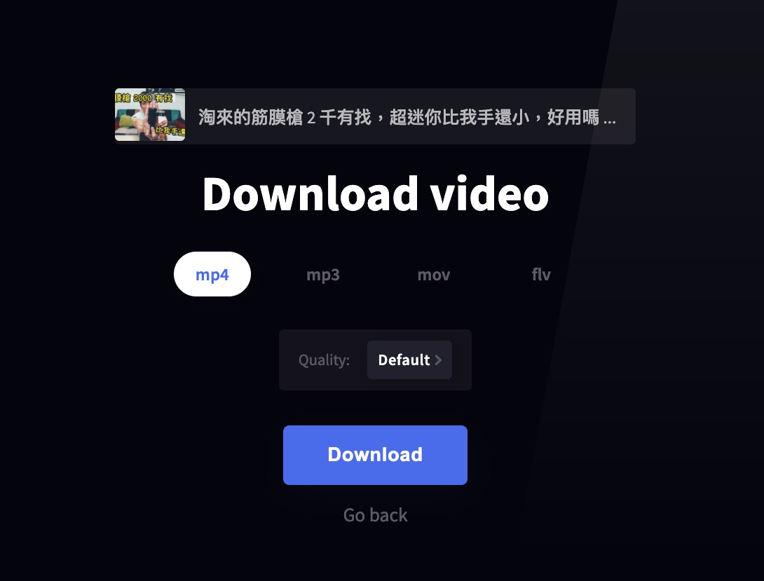 這邊你可以選擇要下載為 mp4、mp3、mov 或 flv 檔案,而品質的部份無法選擇高品質,不過預設下載的就是 720p,本來就是 YouTube 常見的下載解析度了,所以不知道高品質是差在哪裡。