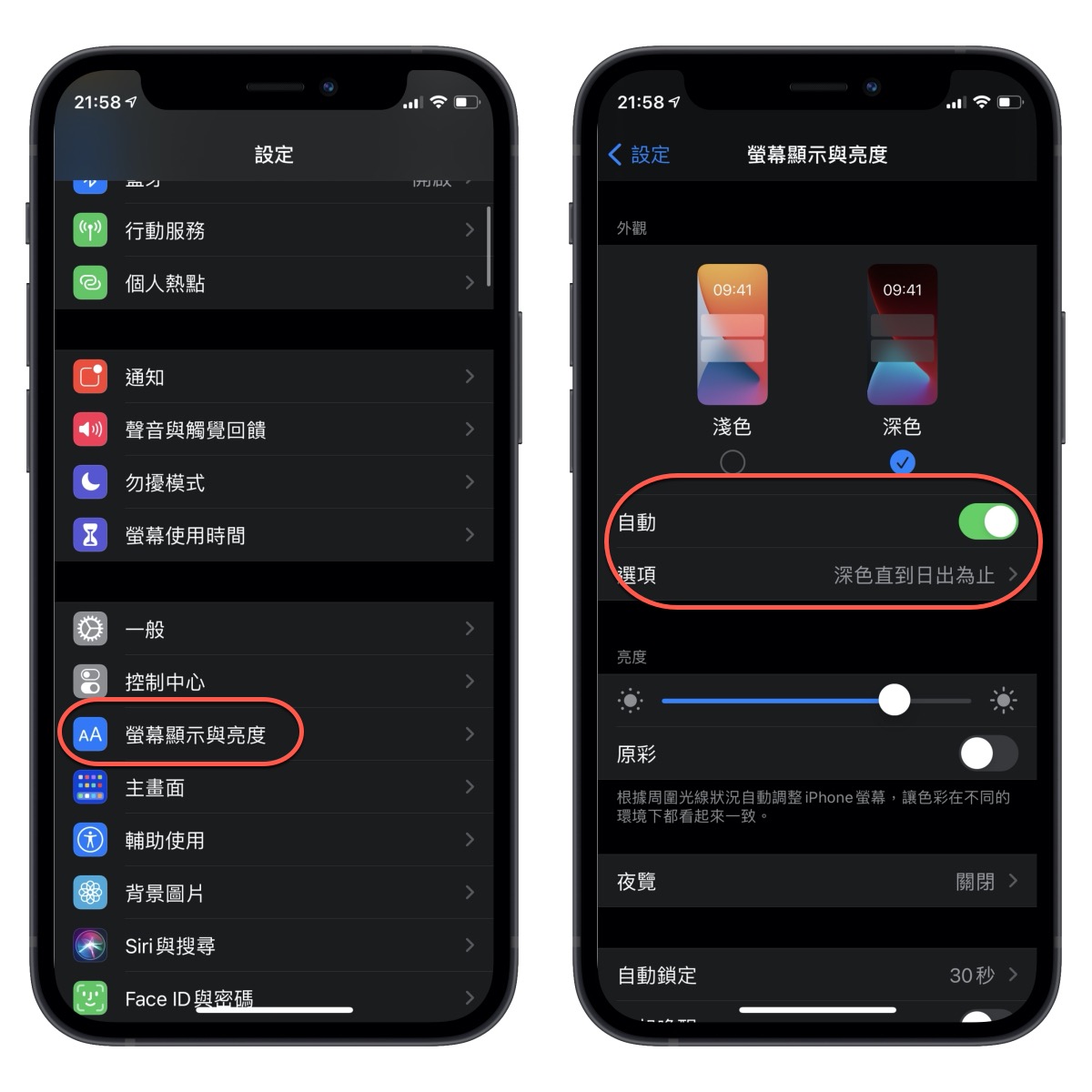 iPhone 的部份可以在「設定」>「螢幕顯示與亮度」,勾選自動,下面可以自行設定時間或是依他預設即可,快去試看看吧,讓眼睛舒服些。