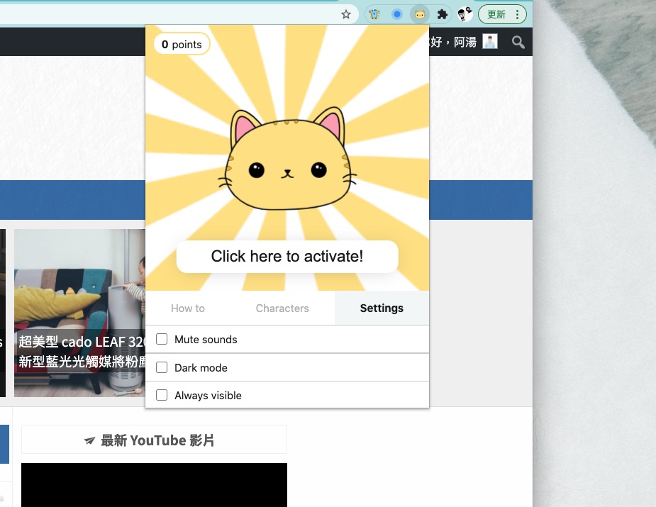 接下來前往你想要使用的網頁後,點擊右上角的小黃貓圖示,然後再點擊「Click here to activate!」啟動。