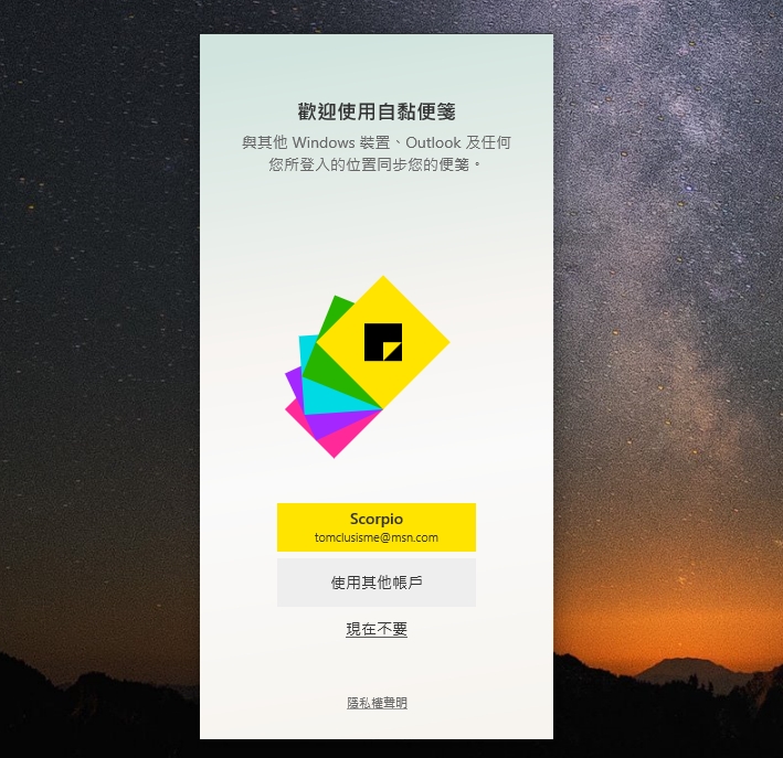 現在的自黏便箋比起以前還多了一個同步功能,只要有登入微軟帳號,即便你在不同電腦上,都可以同步你的便利貼內容,當然你不想同步也是可以的。