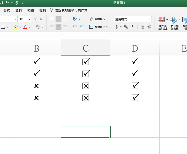 給大家看一下差別, A 欄是用 V 跟 X,B 欄是真正的打勾跟打叉符號,C 欄是有框的打勾跟打叉,往下來看怎麼做吧。