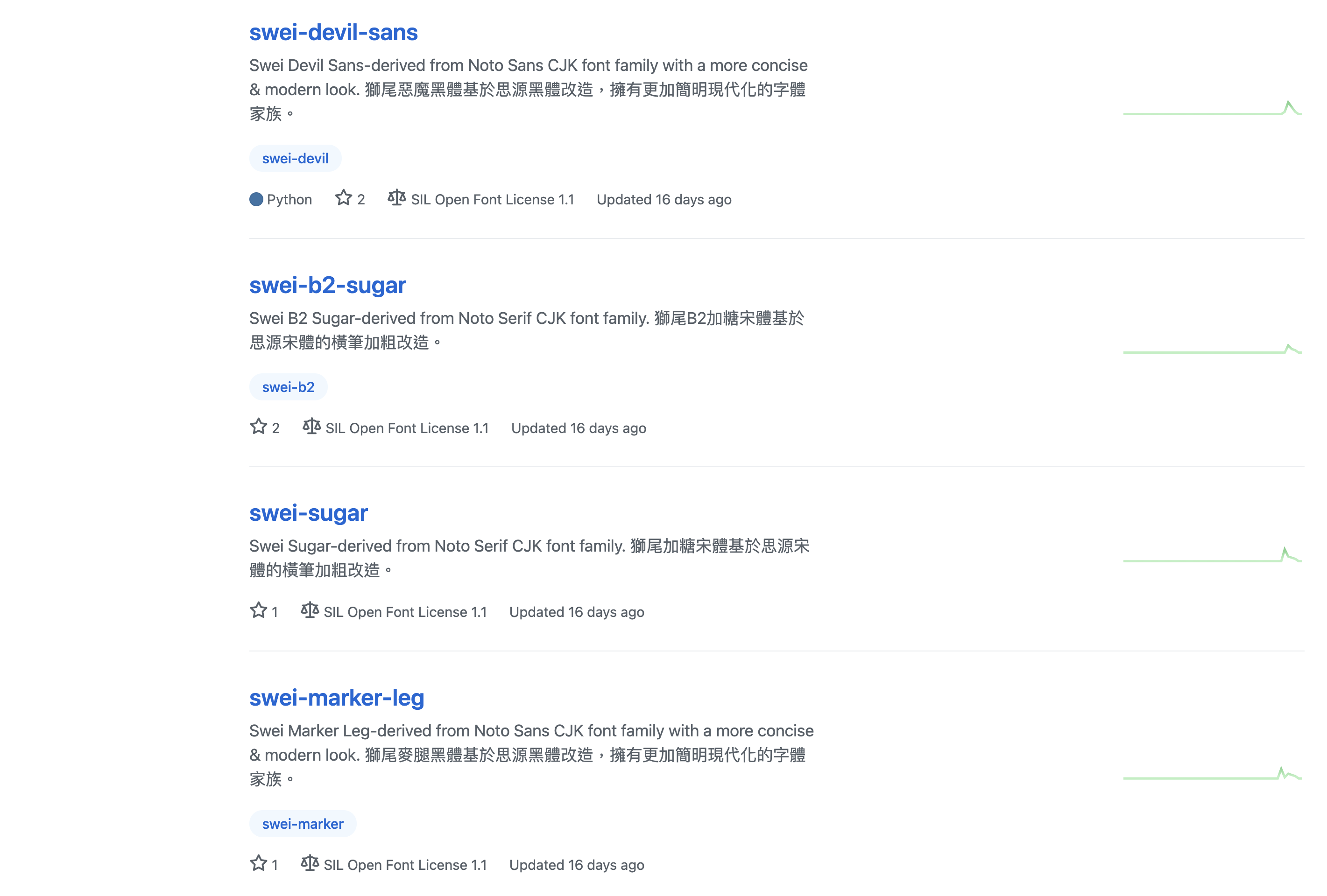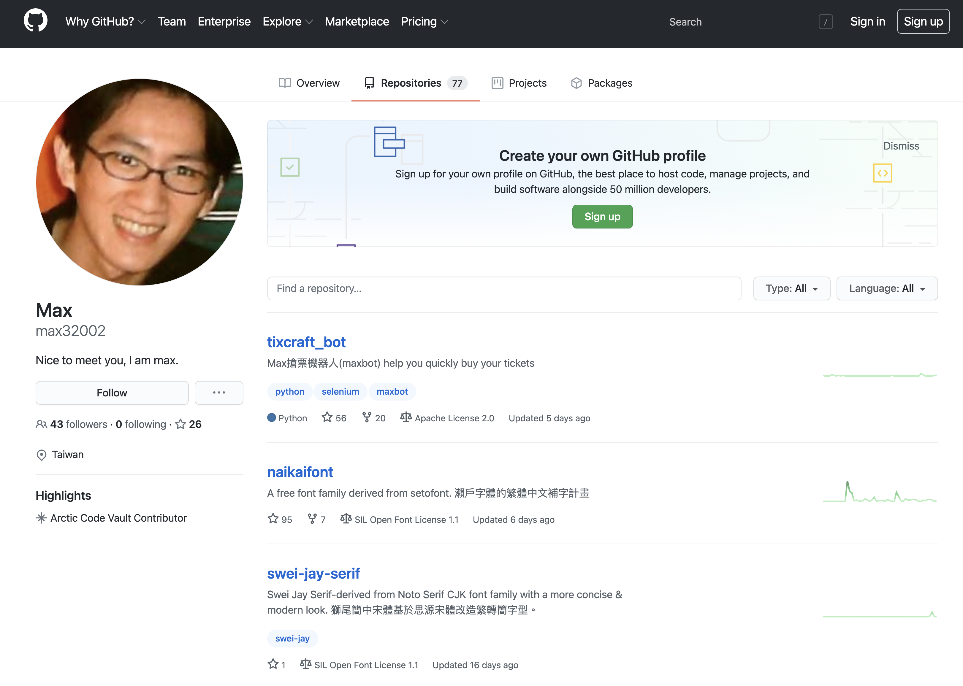 進入網站後就可以在「Repositories」裡查看 Max 這位開發者所分享的內容,其中以獅尾系列字體為主。