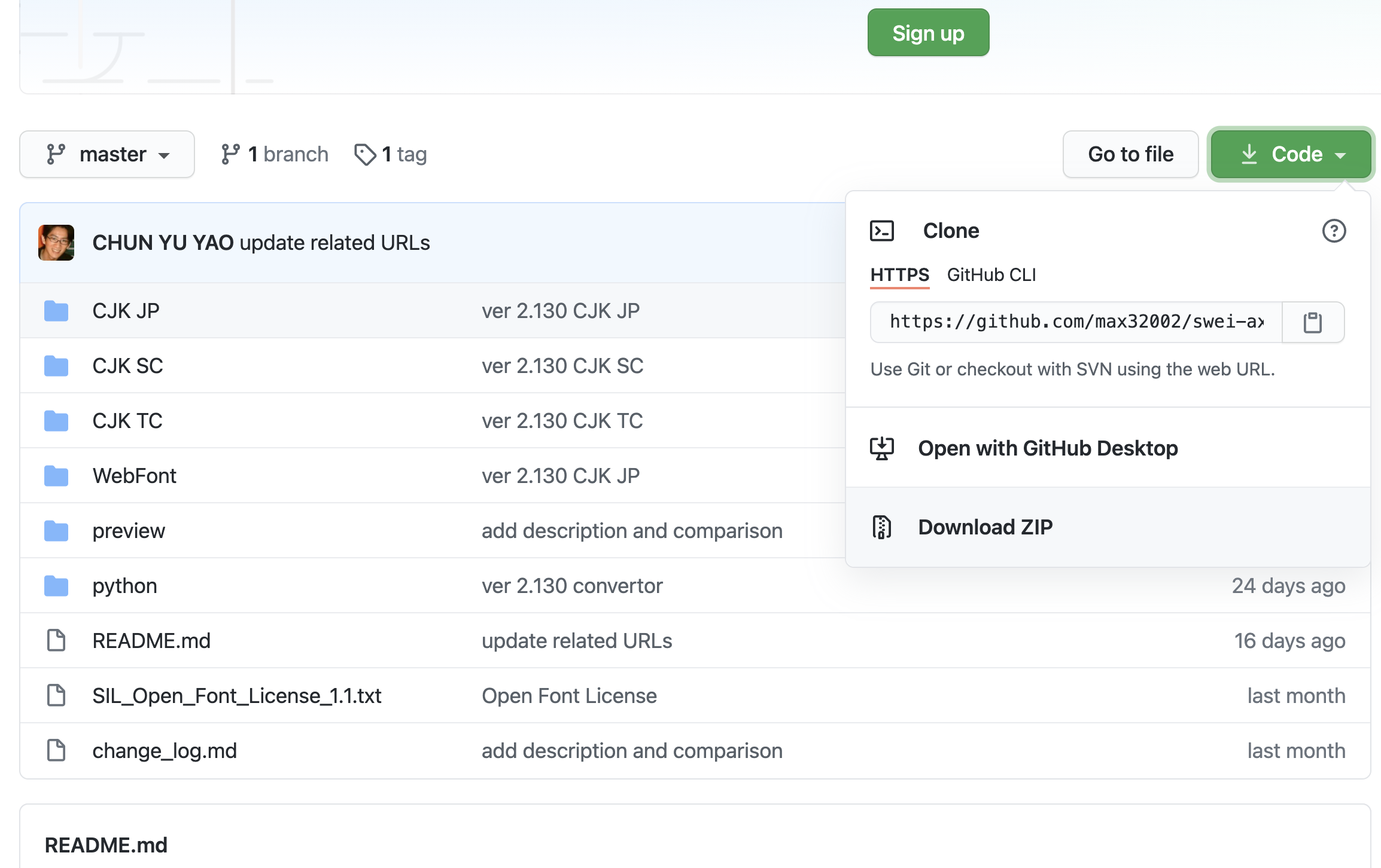 如果想要下載使用的話,在字型的右上都有個「Code」,下拉後點擊「Download ZIP」就可以打包下載了。