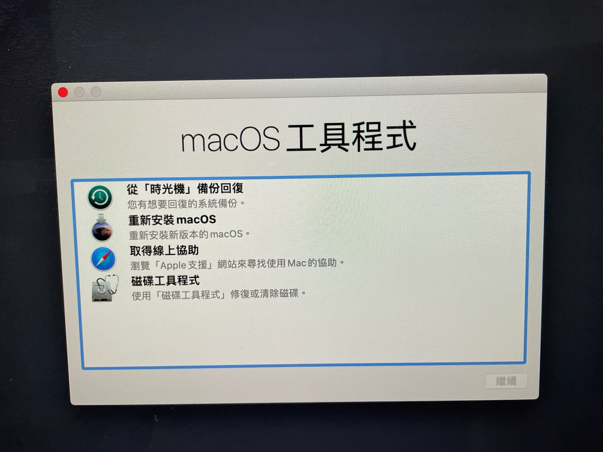 這裡我們主要會用到二個項目,第一個是重新安裝 macOS,不過在重新安裝之前,我們可以先用磁碟工具程式來清理原本的資料。