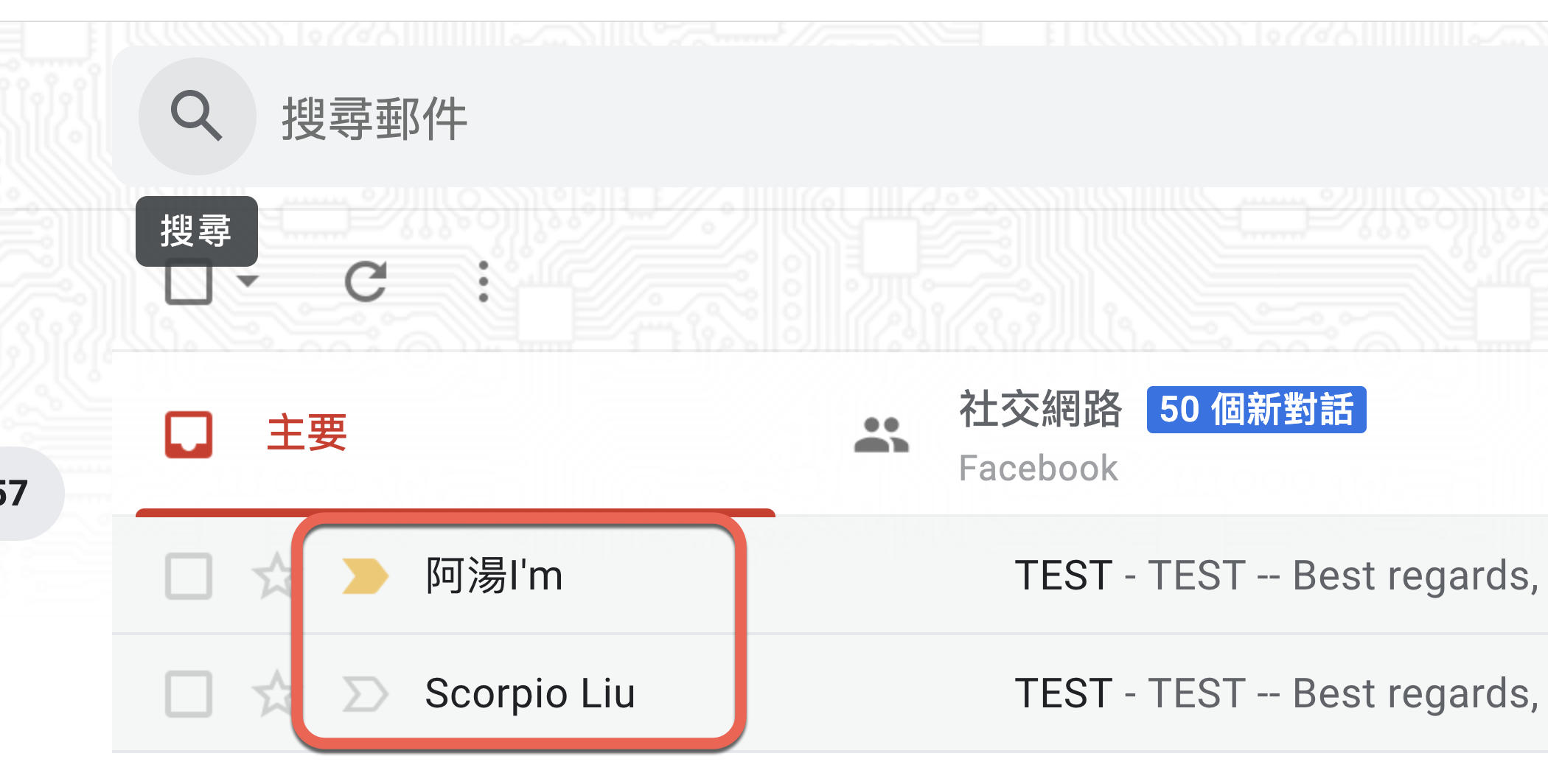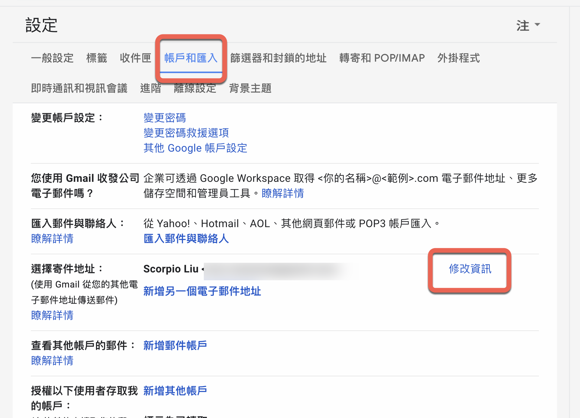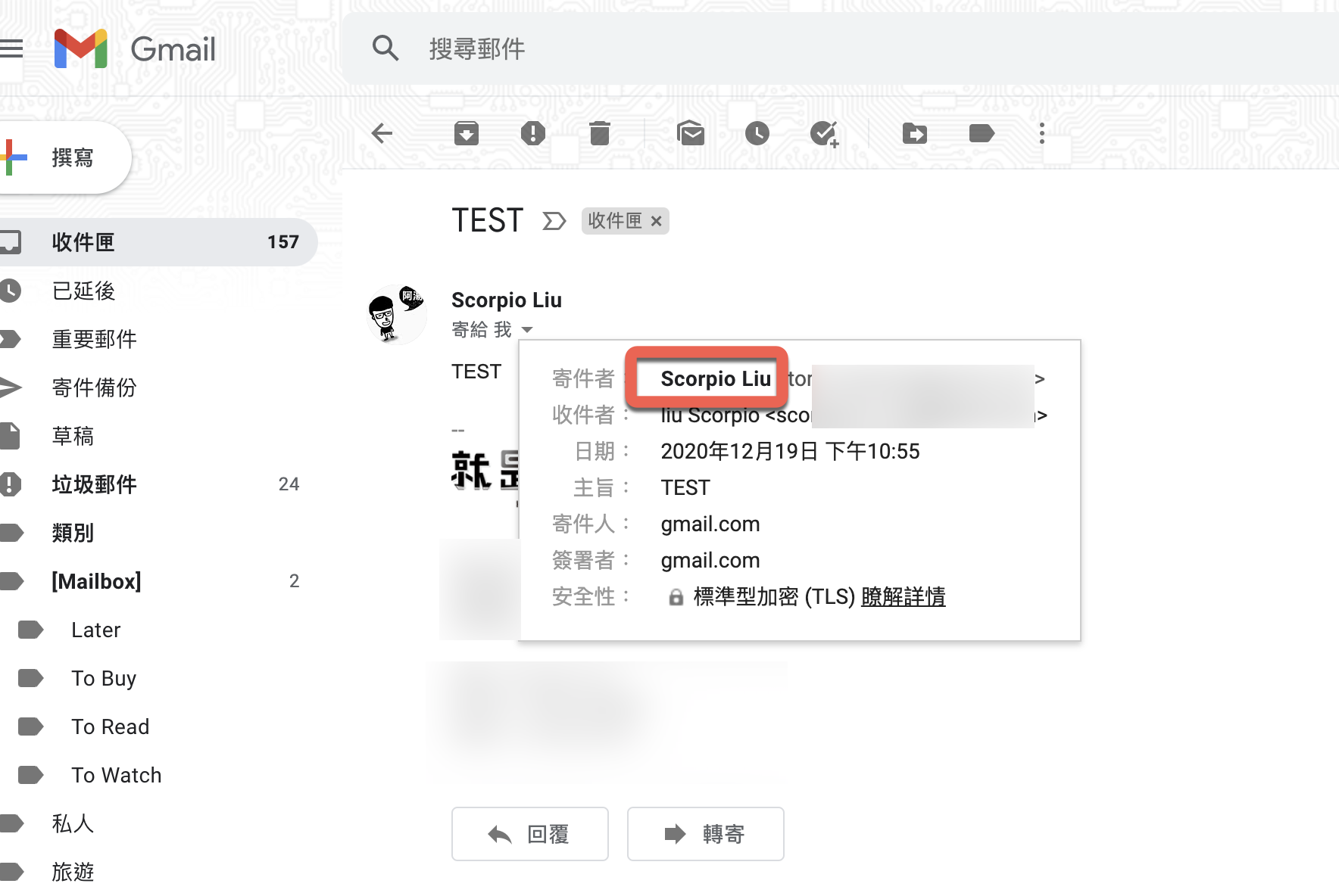 首先我們來看一下,寄的信預設顯示是用 Scorpio Liu,這其實是我 Google 帳戶的名稱,但我們可以自訂。