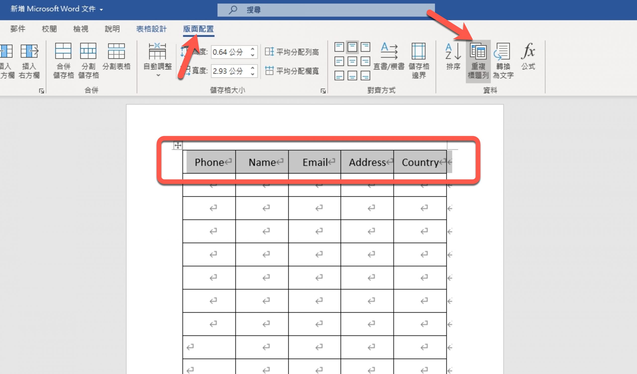 這時,只要先選擇第一行標題列後,點擊上方的「版面配置」,再點擊「重複標題列」,這樣就搞定了。